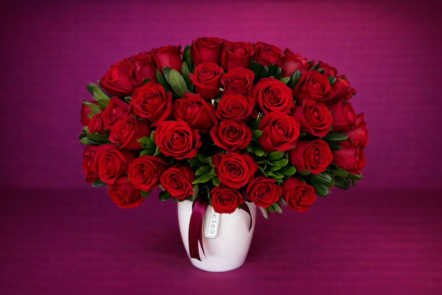 50 Rosas Rojas y Follaje en Base de Cerámica