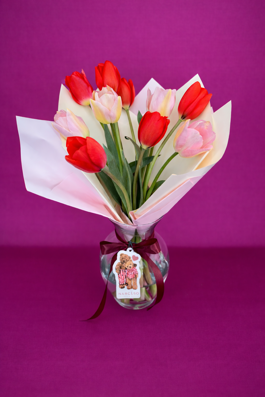 5 Tulipanes Rojos, 5 Tulipanes Morados y Hortensia Verde